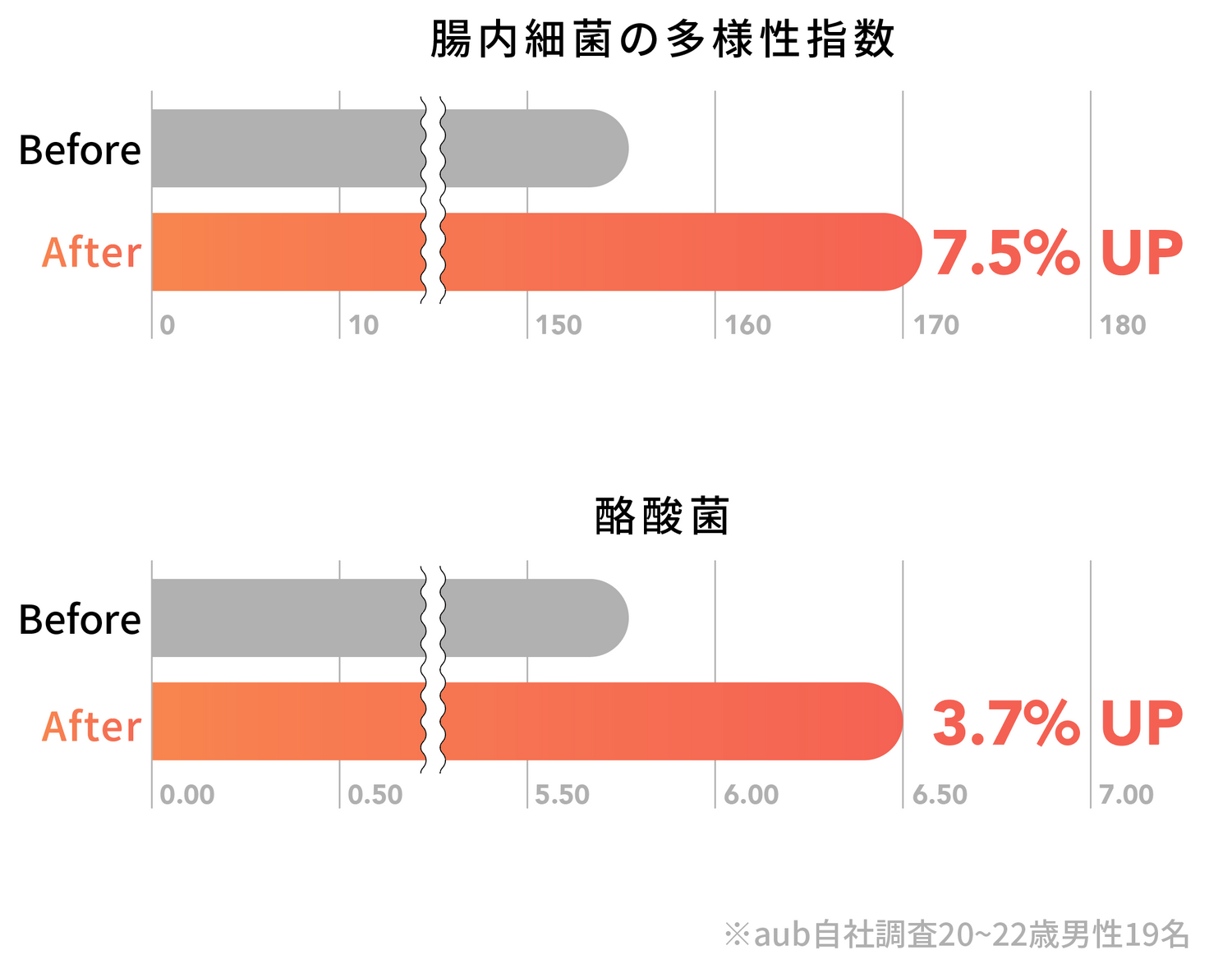 aub BASEを一定期間(2週間)摂取することで、多様性指数が7.5%、酪酸菌3.7%向上。体内で確かな変化を導き出していることも特徴です。