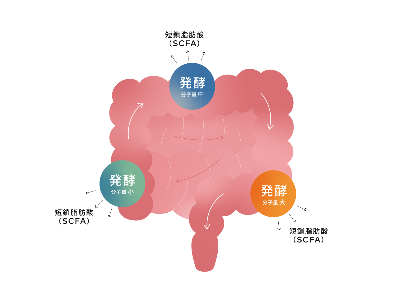 aub GROWには、腸内の隅々まで多様な食物繊維やオリゴ糖が届くよう、原料の分子サイズを考慮した設計が施されています。これにより菌は、長い腸内の様々な場所で持続的にエサを摂り入れることができ、多様な短鎖脂肪酸を作り出すことができます。