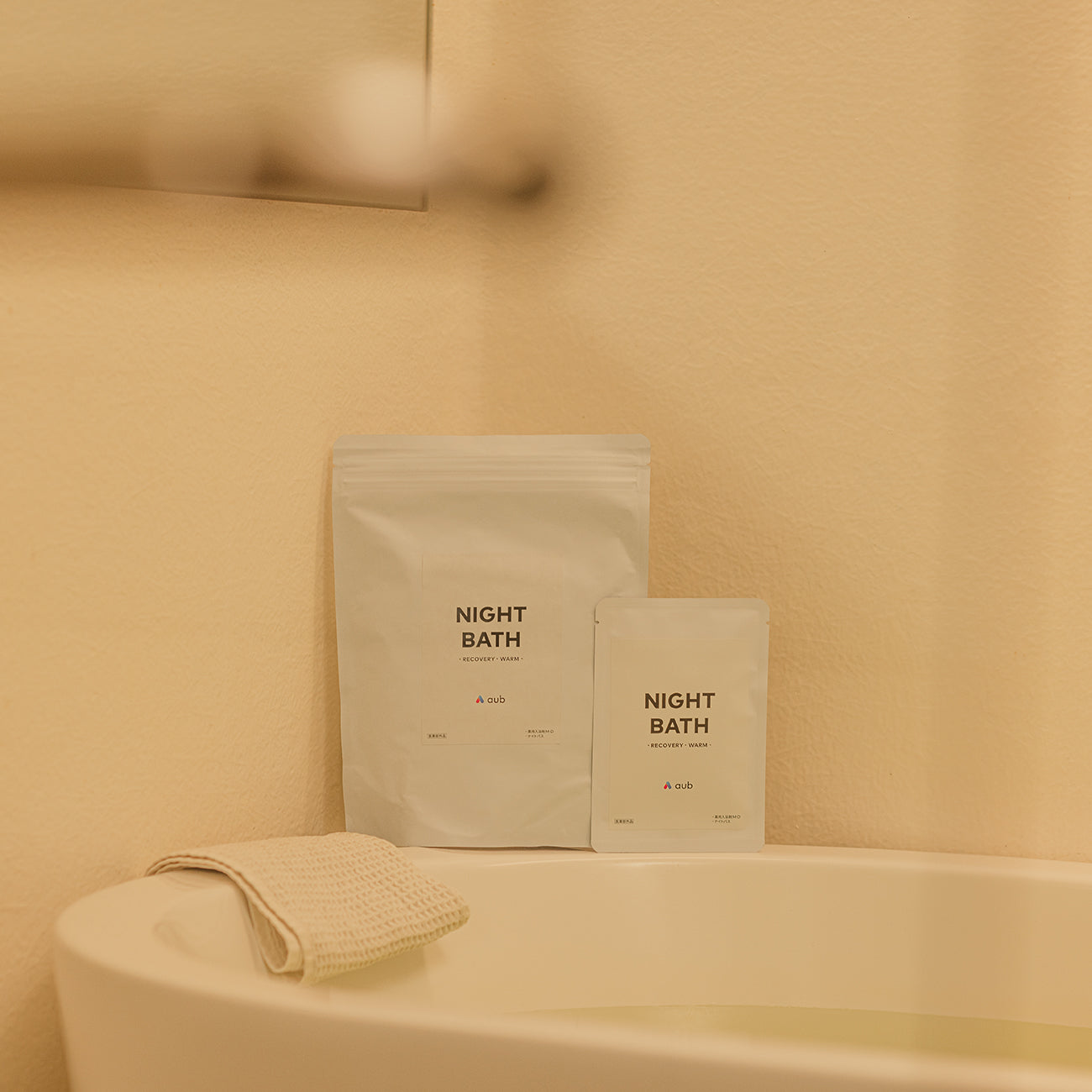 忙しい現代でも、その本質は変わりません。 aubは、入浴を「心とからだを調える時間」として、暮らしの中にもう一度取り入れてほしいと願っています。このNIGHT BATHは、温もりへのこだわりを凝縮し、 自然生薬と温泉ミネラルをブレンドした入浴剤です。 夜への“切り替えスイッチ”となり、あなた本来の回復リズムを引き出すひととき。